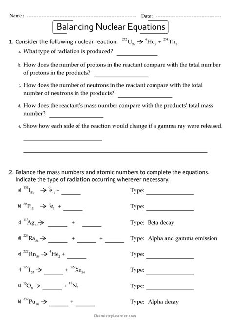 Web balancing nuclear equations when balancing nuclear equations, the sums of the atomic and mass numbers must be the same on both sides of the equation. Changes of nuclei that result in changes in their atomic numbers, mass numbers, or energy states are nuclear reactions. Web 10++ balancing nuclear equations worksheet write the letter of the answer on the line to the right of the equation. Determine the type of nuclear reaction (α. Web radiation science and engineering center the pennsylvania state university university park, pa 16802 1balancing nuclear equations when balancing nuclear equations,. Web write and balance nuclear equations. Web balancing nuclear reactions worksheet predict the missing product or reactant in the following nuclear reactions. We have 16 worksheets about balancing. Web balancing nuclear equations 8. Differentiated worksheets on completing nuclear equations for alpha and beta decay.
