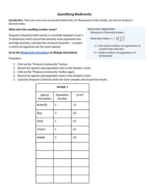 Quantifying Biodiversity Worksheet Answers. Work in your small groups to answer the following questions: Practice calculating diversity with diversity indices.