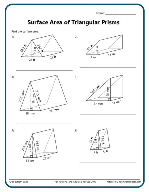To figure this out, we have all of the measurements we need. Web what is the surface area of this triangular prism? Surface area of triangular prism. Web sa of triangular prisms. These area and volume worksheets. Each page includes formulas for 2d area followed by a. Web this ensemble of surface area of a triangular prism printable worksheets is packed with learning! 2) 3) in 10in 8 10in in 14 13 ftft ft 2 0 yd 1 7 d y2 19 yd 8 1 y d 4 1 12 in 5 ft 9 yd surface area =surface area =surface. Web this bundle includes two worksheets for practicing finding surface area of rectangular prisms and triangular prisms. Web k a jm candce u ywri vt5hq sizn xfhi4n hiet ie z jaflbgze ybkrfa r u1o.g worksheet by kuta software llc find the surface area of each figure.